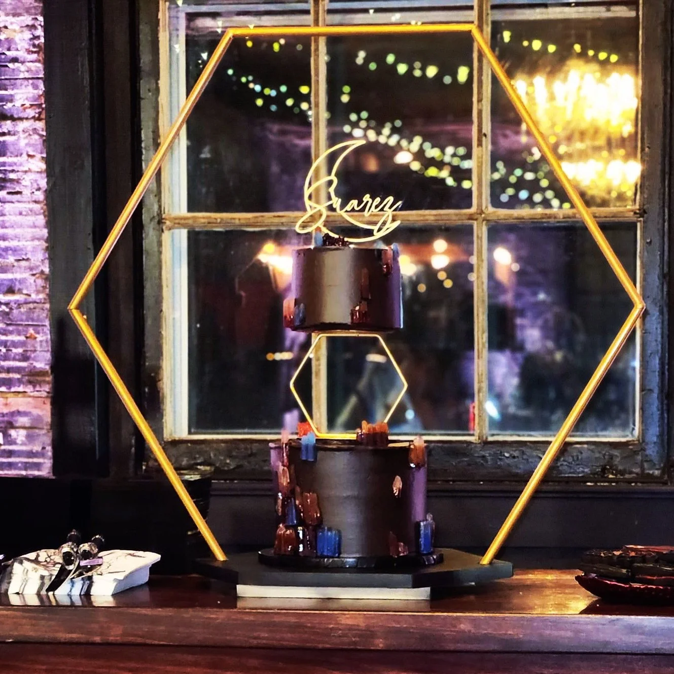At Ana’s Ballroom this dramatic floating-tier wedding cake made a breathtaking statement. The four-tier buttercream design featured a modern suspended middle tier, accented with cascading white roses and greenery for a luxurious, garden-inspired effect. Finished with a soft gold base tier and custom monogram detail, the cake was a stunning centerpiece that perfectly matched the ballroom’s elegant atmosphere.