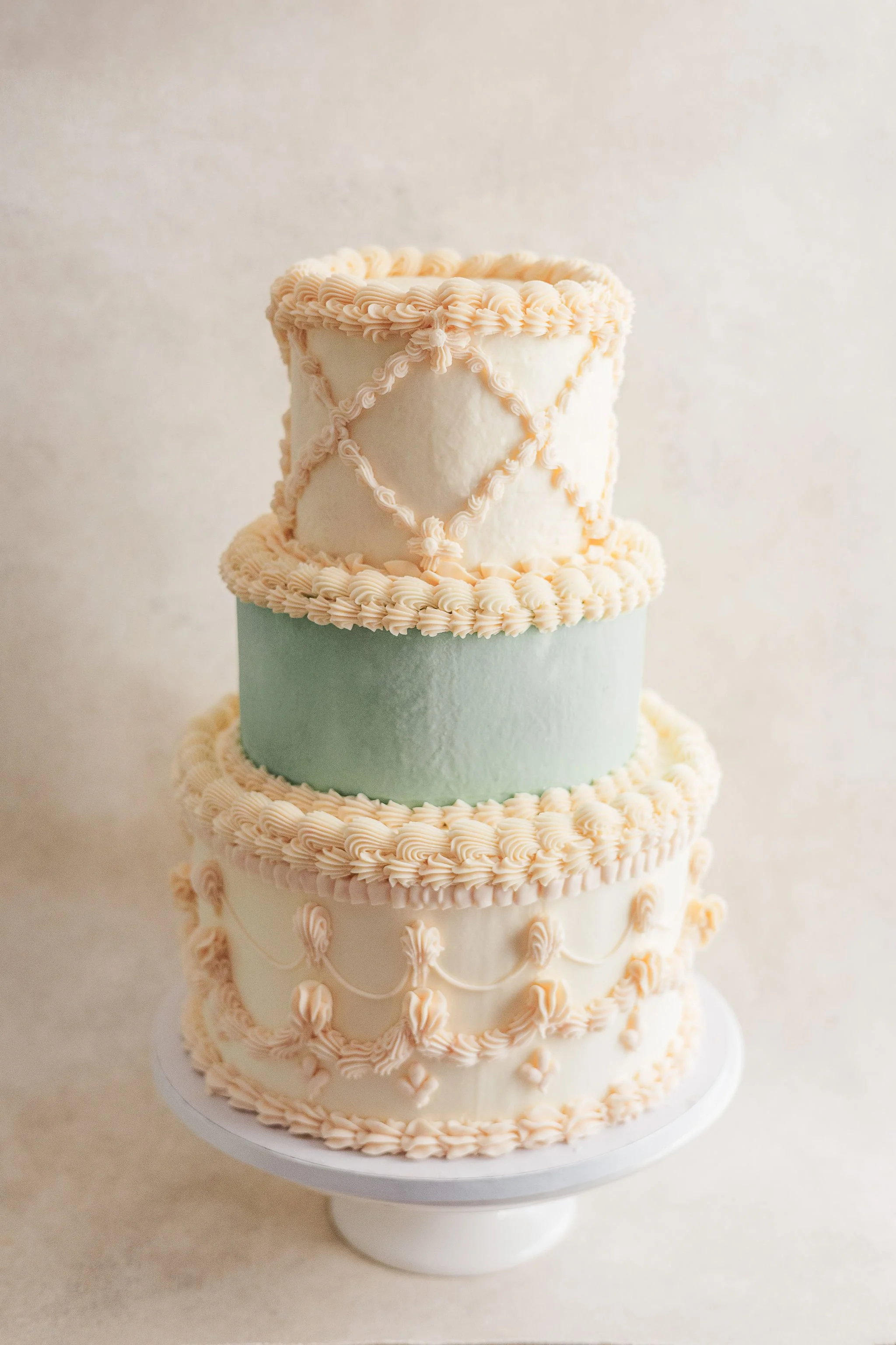 At Callanwolde Fine Arts Center in Atlanta, this vintage-inspired wedding cake brought timeless artistry to a historic venue. Designed with intricate Lambeth-style piping, the three-tiered cake featured scalloped swags, shell borders, and a soft sage green center tier for a subtle touch of color. The ornate buttercream detailing perfectly complemented Callanwolde’s elegant architecture, making the cake a true showpiece for a classic Atlanta wedding. Photo by Shanle Bowen