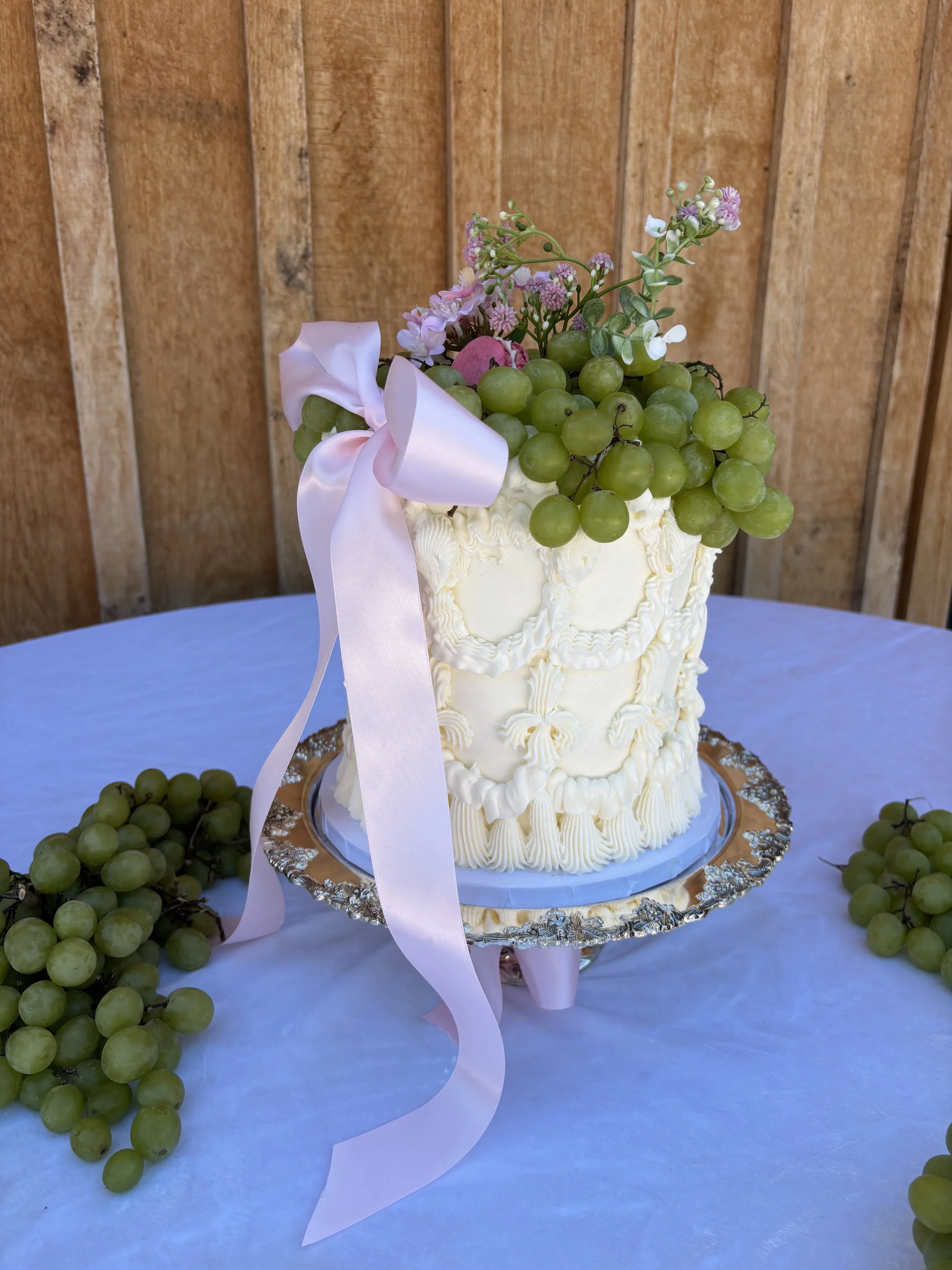 A tall buttercream cake with piped scrollwork, styled with fresh grapes and a ribbon bow for rustic romance.