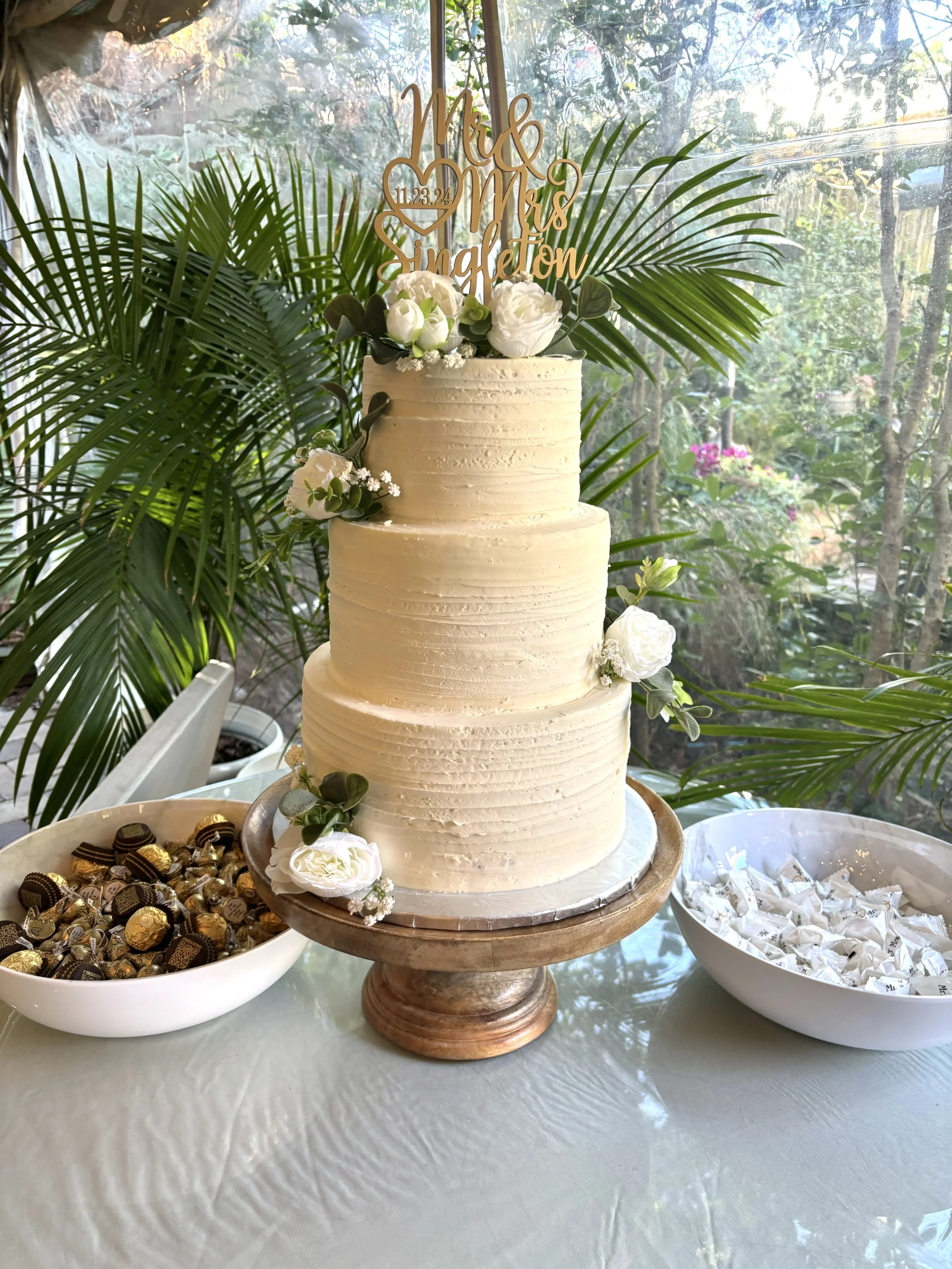 Three tiered buttercream spatula iced wedding cake with artificial white roses in Alpharetta, Georgia