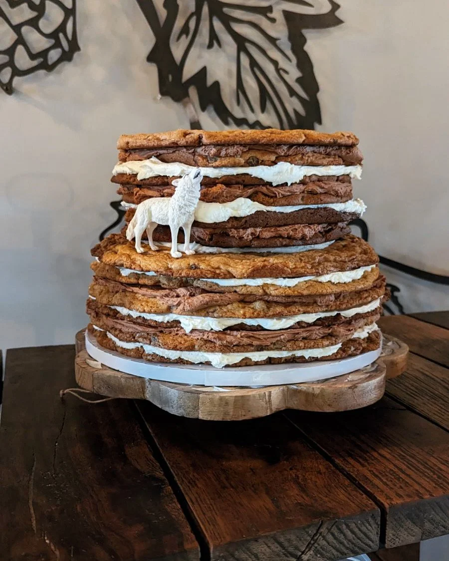 A stacked cookie cake designed for a playful twist on tradition, surrounded by cookie sandwiches for guests.