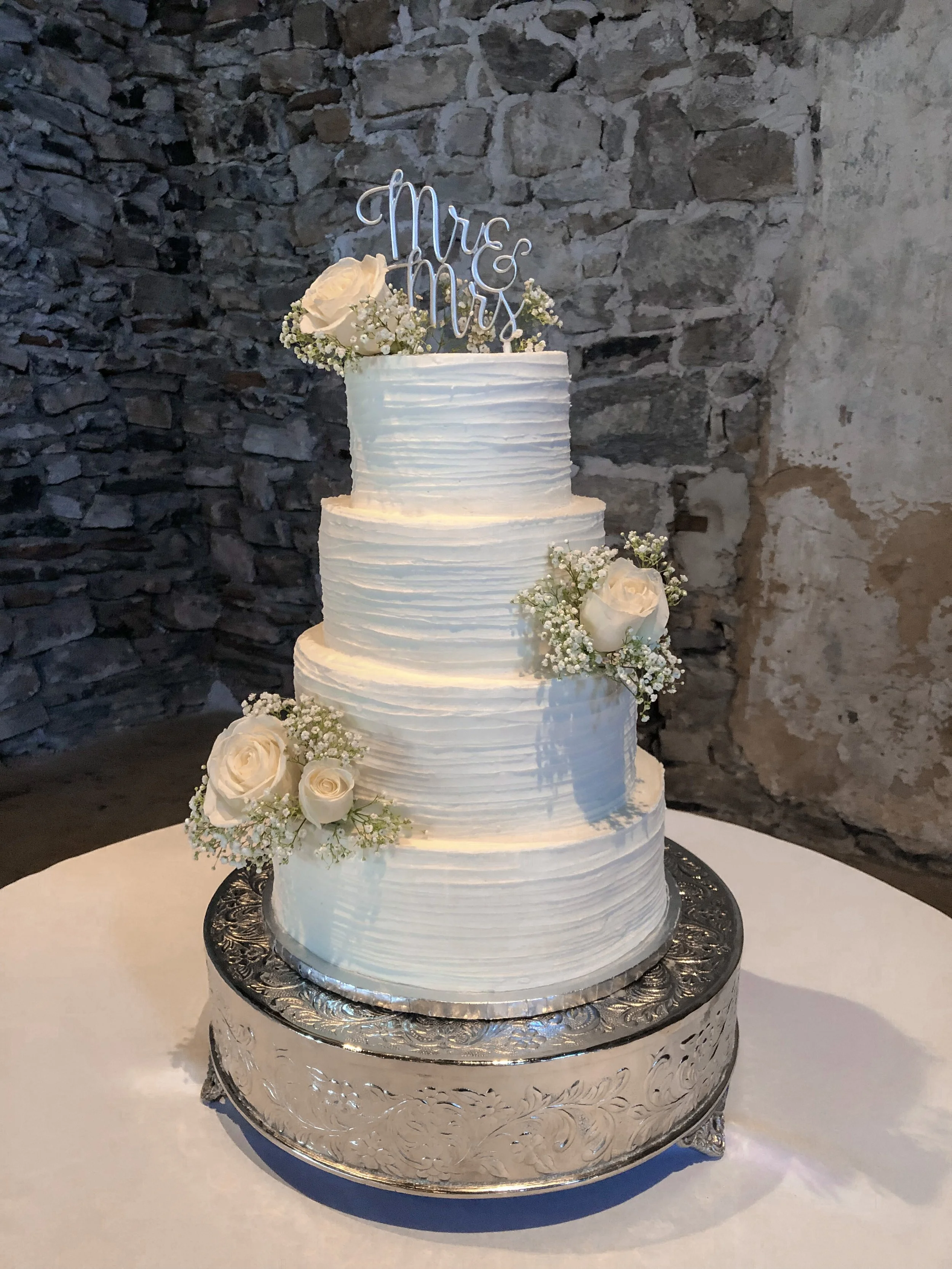 A classic buttercream cake with textured ridges and fresh floral accents, perfect for the rustic brick-and-stone setting.