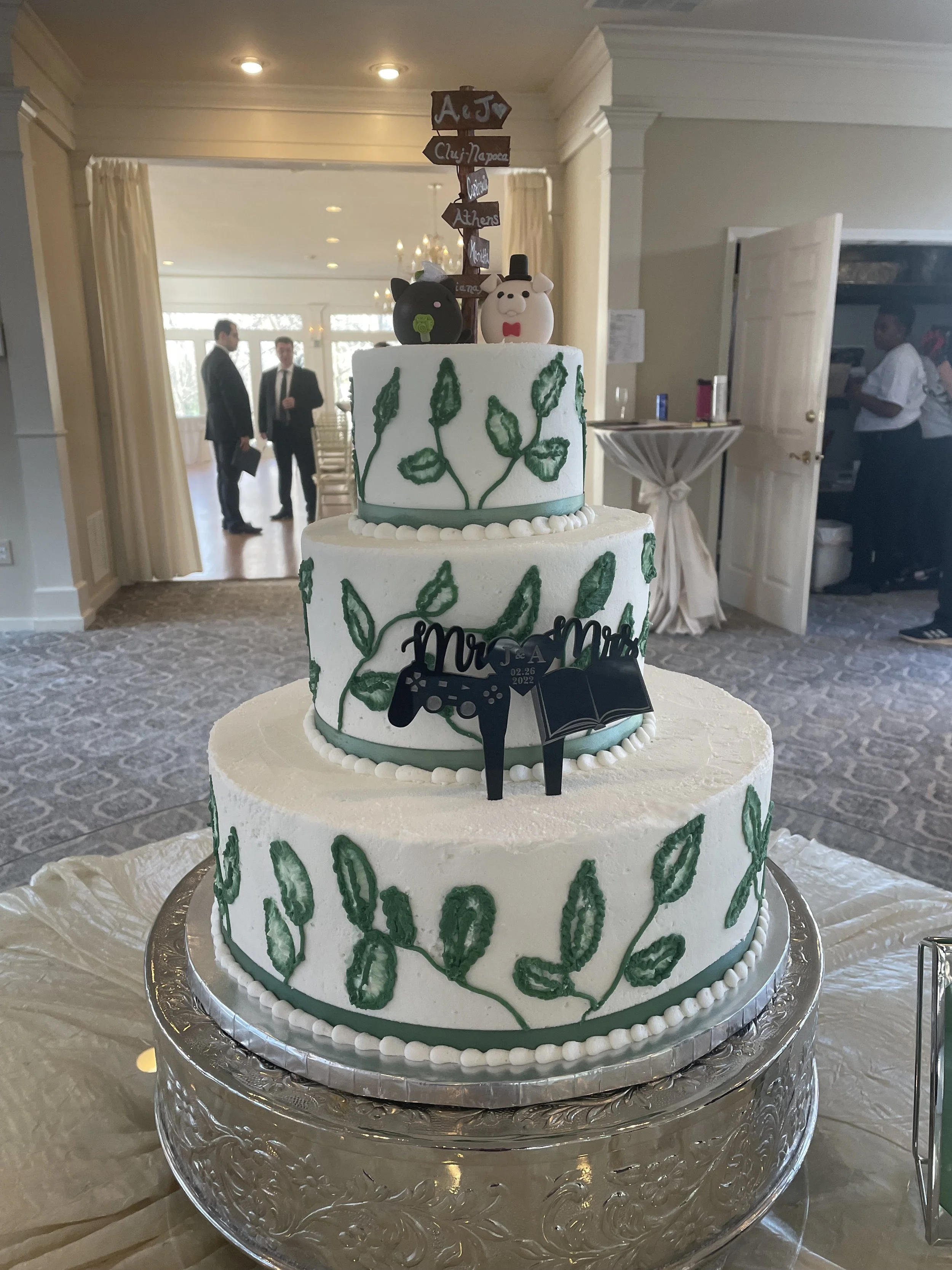 At Vezalay, a scenic North Georgia wedding venue in Dahlonega, this elegant three-tiered buttercream cake was styled with soft textured lines and accented with fresh blush and ivory blooms. The simplicity of the buttercream design paired beautifully with the venue’s natural surroundings, making the cake a romantic centerpiece for the reception. Beside it, a playful golf-themed groom’s cake added a personal touch, showing how custom cakes can celebrate both tradition and personality.