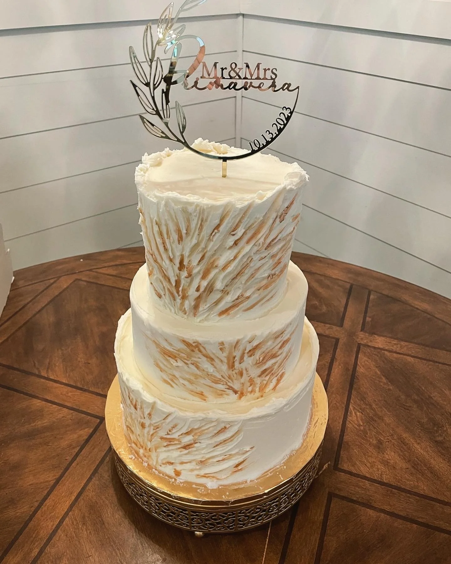 A buttercream cake featuring golden textured strokes, adding artistry and modern flair.