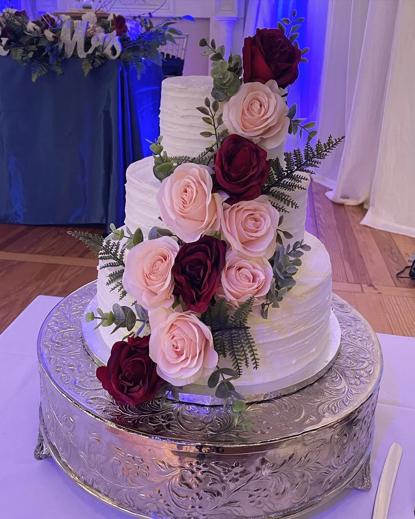 Three tiered textured buttercream wedding cake with artificial red and pink roses and ferns in Buford, Georgia